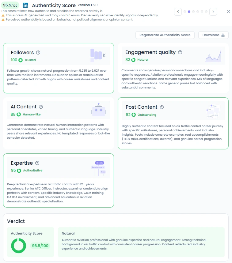 Her follower count shows steady and natural growth, rising from around 5,235 to more than 6,627 without any unusual spikes. She holds an Influence Score of 7, with strong engagement quality driven by thoughtful comments and meaningful discussions. Her audience responds well to her career stories, training insights, and speaking engagements. Her posting rhythm stays consistent with a healthy mix of videos, career reflections, and milestone updates that keep her profile active and trustworthy.