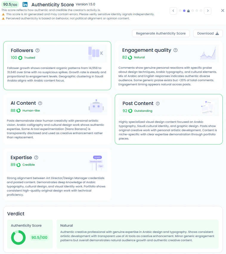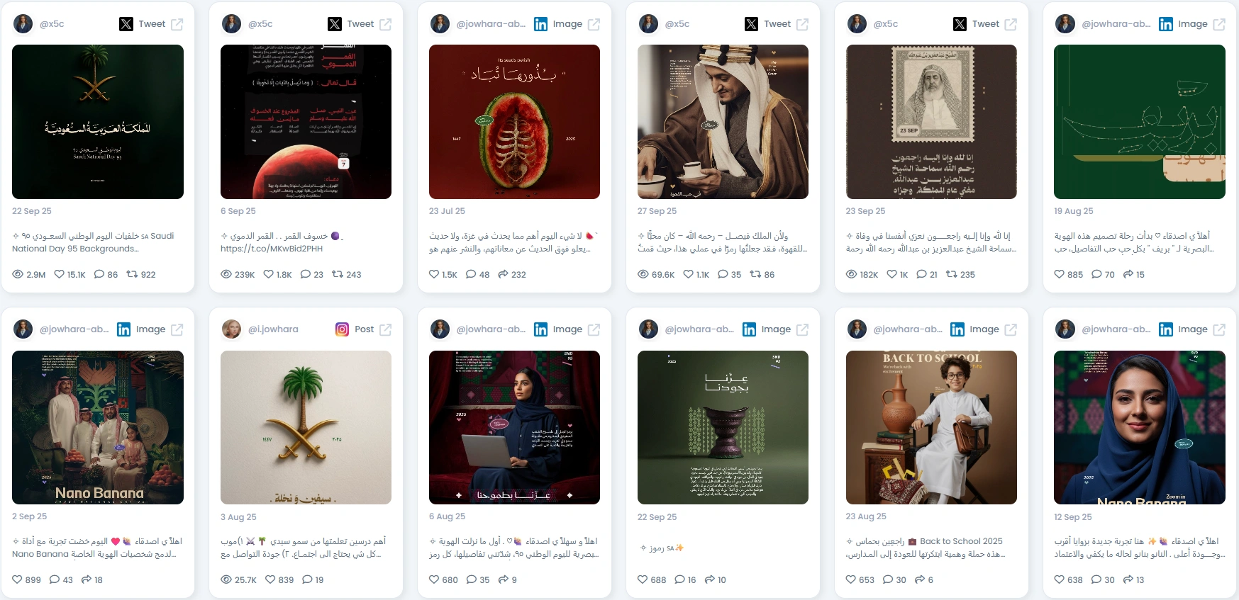 With a 90.5/100 Favikon Authenticity Score, Jowhara’s content reflects genuine creativity and a transparent process. She openly shares her artistic journey, whether experimenting with AI tools in her Nano Banana project or crafting cultural campaigns that highlight Arab heritage. Her posts are praised for their originality, technical skill, and cultural depth, balancing authority with a creative openness that draws her audience in.