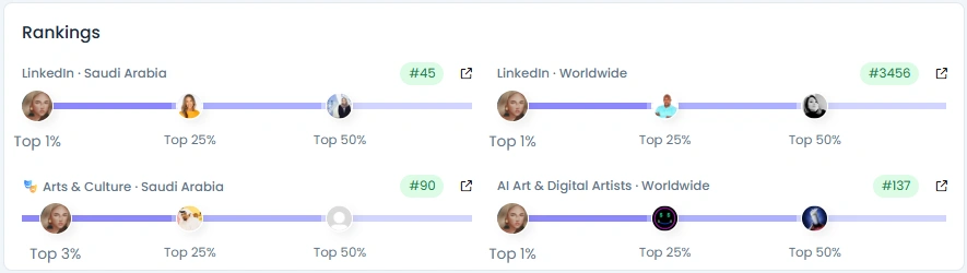 Jowhara has grown her community from 14.5K to over 31.6K followers, with a steady and organic trajectory. Her Influence Score sits at 8,292 points, placing her in the top 1% of AI Art & Digital Artists worldwide and among the top 3% in Arts & Culture in Saudi Arabia. Her content consistently generates thousands of interactions, with some posts reaching into the millions on X, proving her ability to spark large-scale conversations.