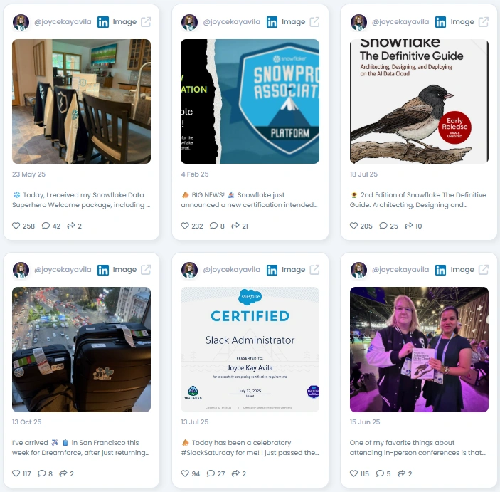 Joyce Avila turns complex data platforms into practical tools people actually enjoy using. She mixes technical depth with clear storytelling and a knack for teaching. Her posts show real projects, certifications, and book progress. People follow because she makes enterprise data approachable and actionable.
