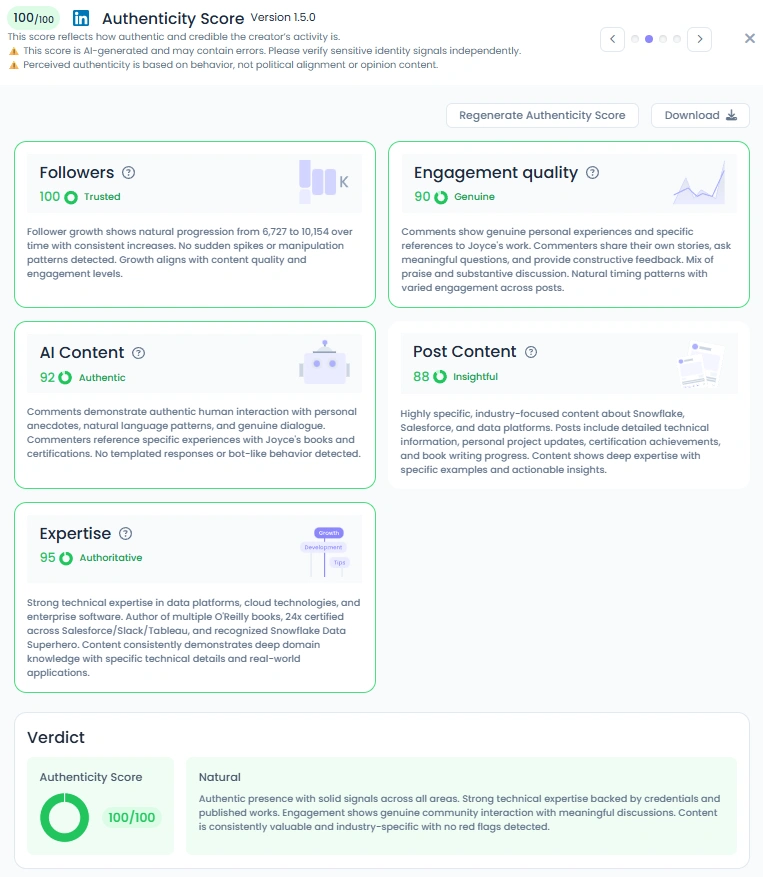 Joyce scores 100/100 on Favikon’s Authenticity Index, and it shows. Her feed includes candid conference photos, certification badges, and progress updates on technical writing. Comments are genuine and reference specific learnings from her posts. The result is a trustworthy presence that blends authority with human detail.
