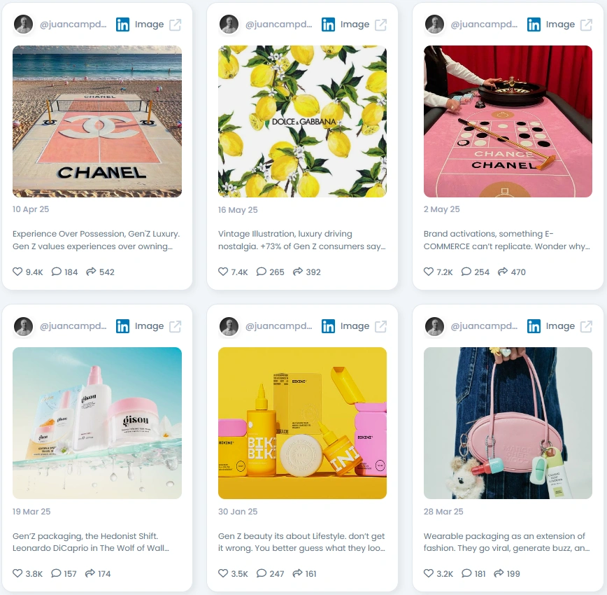 People follow Juan because he breaks down beauty marketing with clarity and elegance. His posts combine data, design, and storytelling in ways that feel effortless. One day he analyzes the nostalgia-driven success of Dolce & Gabbana’s vintage packaging, and the next, he discusses how Chanel’s experiential activations redefine luxury for Gen Z. His writing is accessible yet sophisticated, allowing both creative directors and marketing students to learn something new.