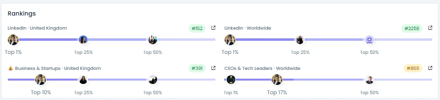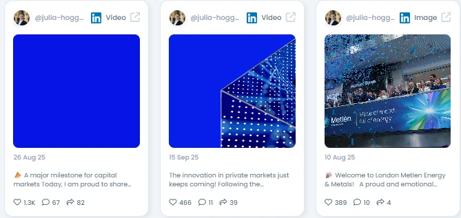 Julia counts over 21,000 followers, ranking in the Top 1% on LinkedIn UK and the Top 10% in Business & Startups. Her engagement is strong and natural, with high-quality comments from industry peers. With an influence score of 5,921 points, her reach extends globally, reinforcing her position as one of the leading voices in finance and leadership.Every post, from new listings to innovation updates, garners hundreds of interactions and genuine dialogue.