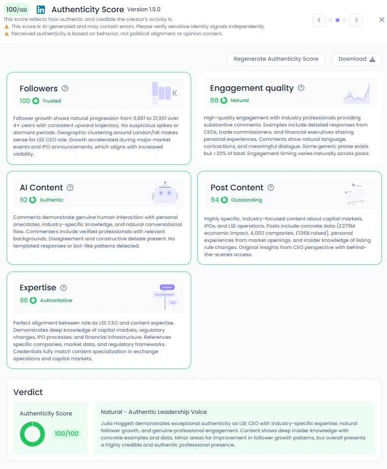 With a Favikon Authenticity Score of 100/100, Julia ranks among the most credible voices on LinkedIn. Her follower growth is steady and organic, her engagement comes from verified professionals, and her tone reflects lived experience. Posts highlight major milestones like market openings and sustainability listings, showing pride without pretense.It’s a blend of CEO-level authority and a grounded sense of purpose, the kind of authenticity that builds long-term trust in an industry that needs it most.