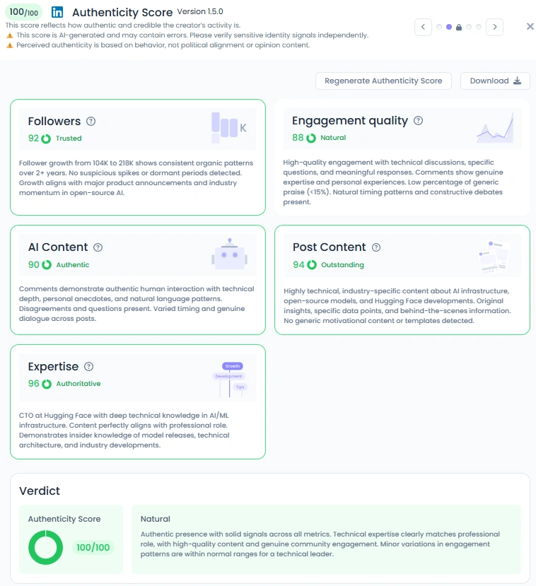 Julien holds an Authenticity Score of 100/100, a rare signal of credibility. His posts showcase human voice and genuine expertise, whether celebrating Hugging Face milestones, sharing behind-the-scenes developments, or commenting on broader AI trends. Comments on his content are rich with technical debate, thoughtful questions, and professional engagement, highlighting the authenticity of his reach. Instead of polished marketing talk, Julien shares the messy, exciting, and collaborative reality of AI innovation.