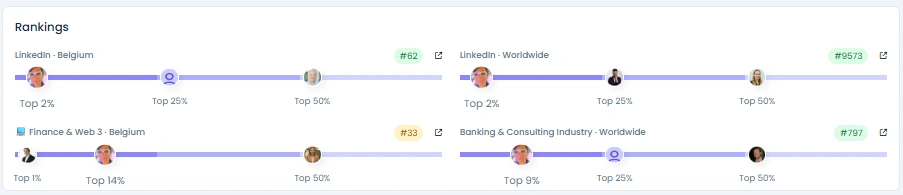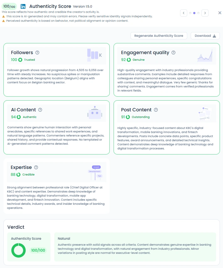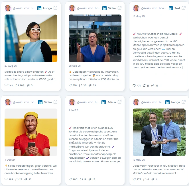 Karin’s audience grew from roughly 4,500 to 6,000 followers, showing steady organic interest among banking professionals. Her Engagement Quality sits high at 92/100, and Post Content scores 91/100, reflecting useful, industry specific material. Her Influence Score places her prominently in the Belgian banking and fintech conversation, with strong rankings on LinkedIn and steady posting rhythm.