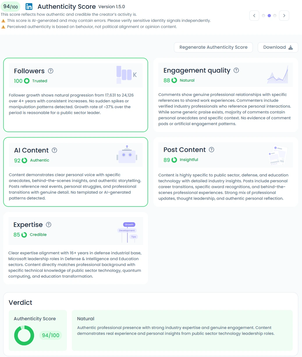 With an Authenticity Score of 94/100, Kate’s presence feels grounded and human. Her followers engage naturally with her reflections on mentorship, resilience, and professional growth. Her posts often include behind-the-scenes moments, photos from events, or thoughtful commentary about current issues in education and equality. The conversations that follow are rich, real, and community-driven.
