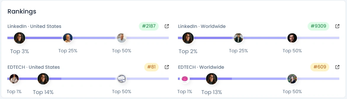 Kate has an audience of 24,100 followers on LinkedIn, growing steadily at around 37% over four years. Her Influence Score sits at 5,312 points, placing her among the top 3% of LinkedIn voices in the United States and top 1% in EdTech. She posts roughly three times a month, generating strong engagement through storytelling, milestones, and industry advocacy.