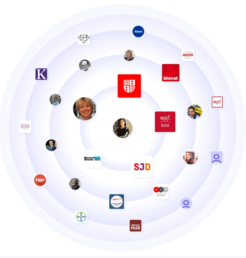 Her circle spans universities, research centres, business schools, and executive networks. She is connected with UPF BSM, Harvard/Deusto collaborations, TEDx organizers, impact hubs, and corporate partners in life sciences and education. That mix gives her cross-sector credibility in academia, business, and public speaking. Her network helps amplify research into practical programs and public events.