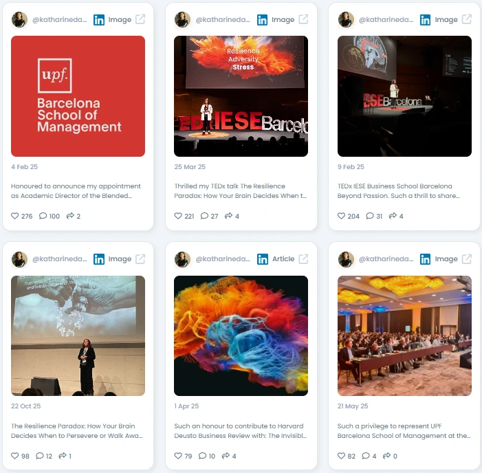 Katharine partners with business schools, executive education providers, research institutions, and conference organizers. She contributes to Harvard-Deusto Business Review, TEDx stages, and executive programs at UPF. These collaborations help her scale neuroscience insights into classroom modules, thought pieces, and public lectures. They also give partners credible academic authorship and engaging public programming.