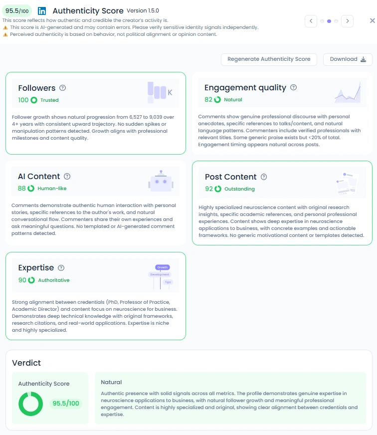 Katharine scores 95.5/100 on Favikon’s Authenticity metric, which signals a genuine and consistent presence. Her feed features photos from talks, academic announcements, and event panels that show real professional moments. Commenters engage with thoughtful questions and references, not generic praise. Her balance of original research citations and personal storytelling makes her both authoritative and approachable.