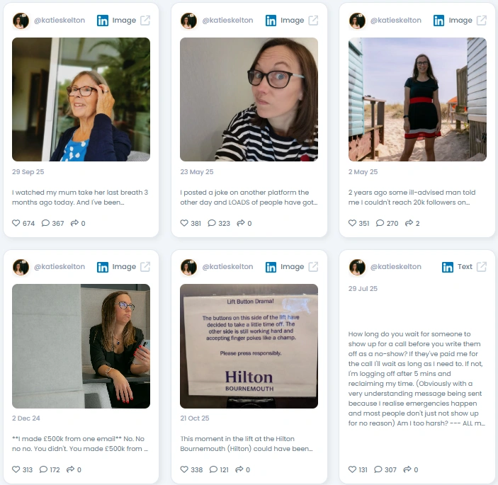 Favikon scores Katie 99 out of 100 for authenticity. Her feed features candid selfies, personal moments, and business wins that feel grounded. Comments are full of stories and specific follow-ups rather than generic praise. That pattern shows a creator who is both expert and relatable.