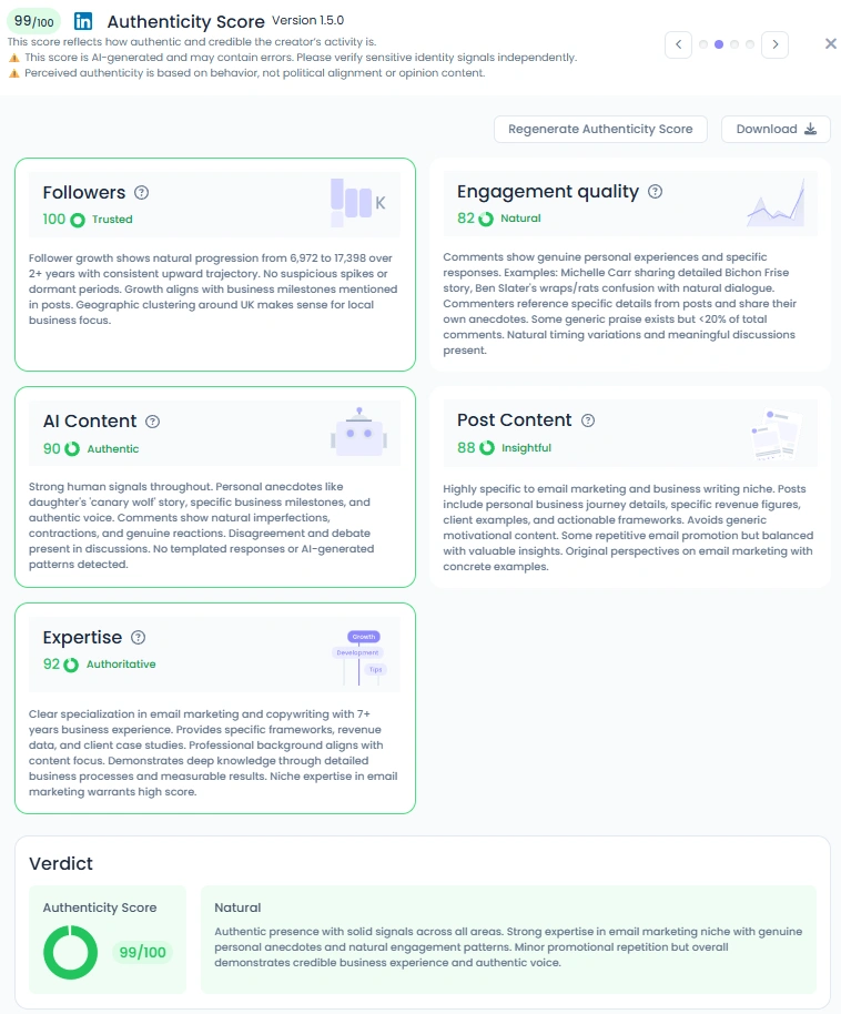 Katie’s follower base grew from about 6,972 to 17,398 over more than two years, showing steady organic reach. She holds an Influence Score of 5 with roughly 6,974 Favikon points. Engagement quality sits at 82, and expertise is rated around 92, reflecting deep niche knowledge in email and copy. Her posting rhythm mixes short, punchy posts with longer newsletter lessons and occasional product/tool announcements, which keeps her community active.