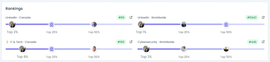 Her LinkedIn following grew from about 7,087 to 14,214 over time with steady organic momentum. Influence Score is 5 with 6,334 points. Engagement quality sits at 82 and AI Content at 90, reflecting active, thoughtful threads. She ranks in the top 2% on LinkedIn in Canada and top 3% worldwide for Cybersecurity.