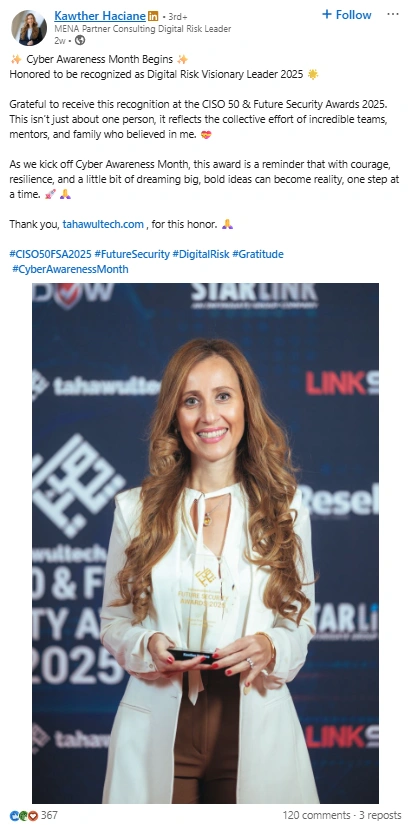 Kawther is a Digital Risk leader and cybersecurity advocate at EY. She guides complex programs across the MENA region, joining strategy with on-the-ground execution. Her feed documents real work. You see first-ever events in Riyadh, client milestones, and award moments like Digital Risk Visionary Leader 2025. She brings a consultant’s structure and a community voice that celebrates teams and families. She positions herself as the partner who turns risk into resilience.