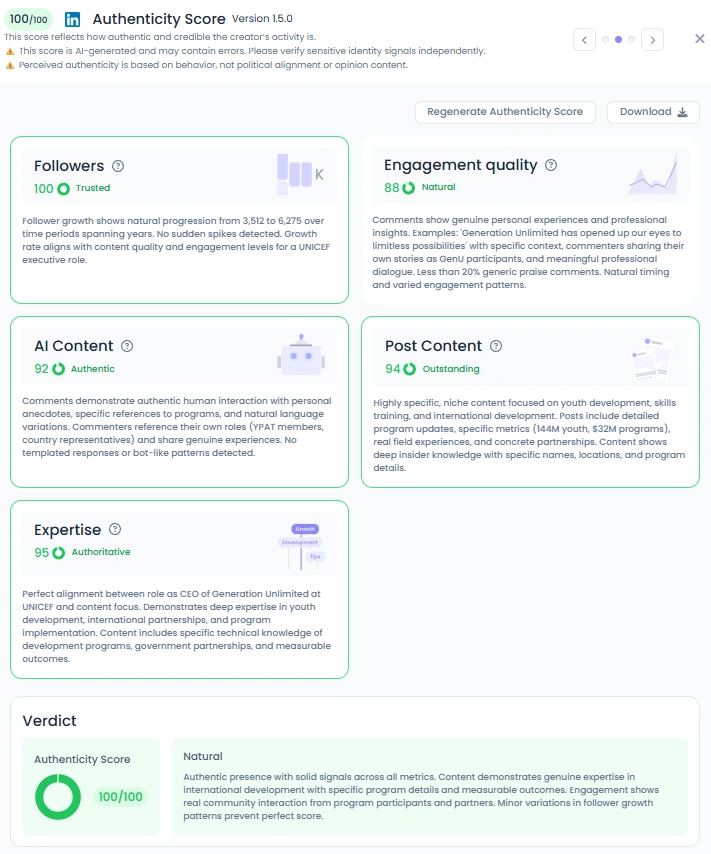 Kevin’s authenticity score sits at a perfect 100/100, and it shows. His content mixes professionalism with heartfelt storytelling a balance few global executives pull off. Comments on his posts often come from real participants in GenU programs, sharing how his work impacts their lives. There’s no corporate fluff, no AI-written tone just genuine dialogue, optimism, and a touch of humanity that builds trust in every post.