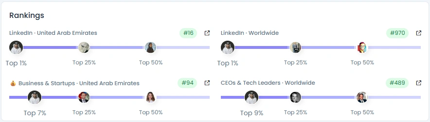 Khalid has grown his LinkedIn following from 14,952 to over 47,000 in two years, showing strong and steady progression. His Influence Score of 7,181 points places him in the top 1% on LinkedIn in the UAE and top 10% worldwide for CEOs and Tech Leaders. Engagement quality scores a solid 72/100, reflecting a mix of industry peers, partners, and thought leaders actively engaging with his content. His posting rhythm is consistent, with frequent updates tied to major company milestones and partnerships.
