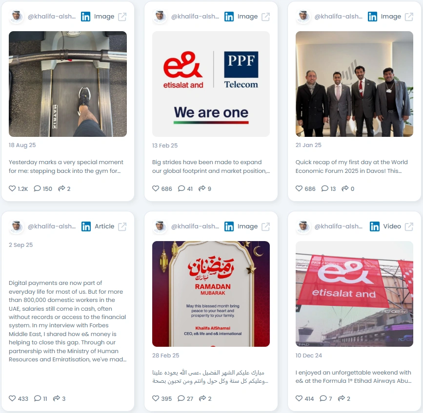 Khalifa holds an Influence Score of 5,500 points, placing him among the top 1% of LinkedIn creators in the UAE. His following grew steadily from 15,000 to over 27,000, reflecting strong regional and global appeal. His posts spark consistent interaction, with engagement from C-suite peers and key figures across the telecom and tech sectors. His Engagement Quality score of 92 further underlines his ability to connect meaningfully with his audience.