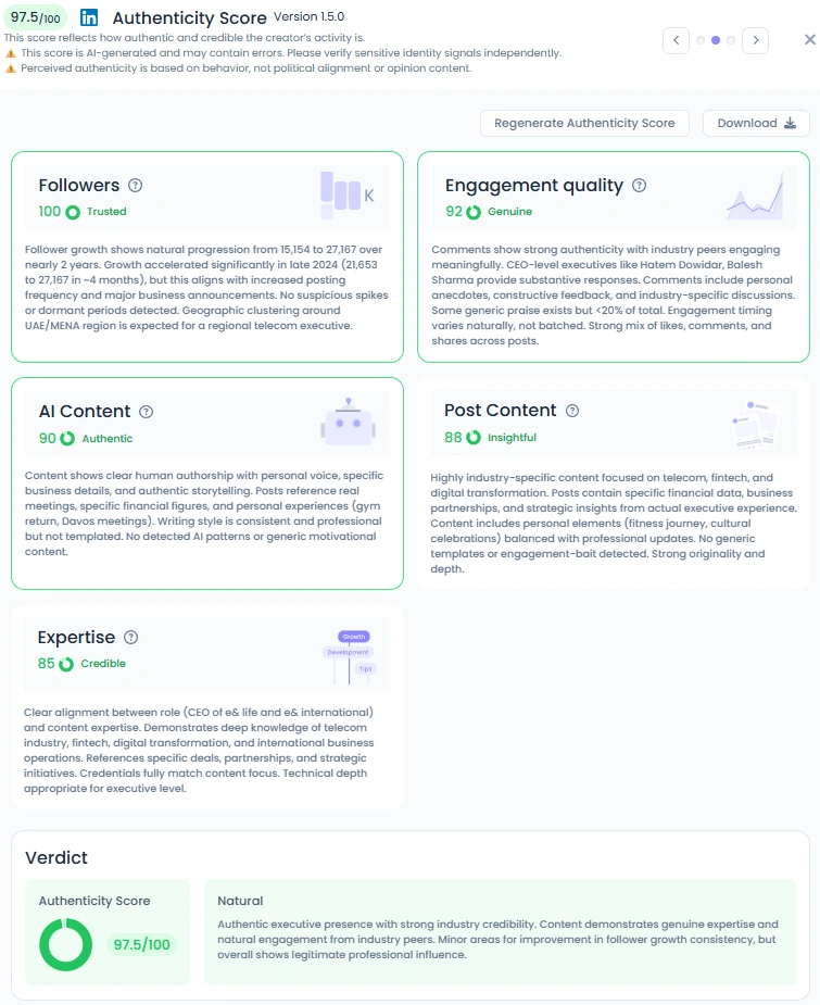 With an Favikon Authenticity Score of 97.5/100, Khalifa’s online presence mirrors his executive integrity. His posts are rooted in real experiences, whether attending Davos, working out after a long break, or celebrating cultural occasions. The mix of professional depth and relatable storytelling makes his content stand out in the corporate world. Engagement from top-level executives and thought leaders shows that his insights carry genuine weight, not just reach.