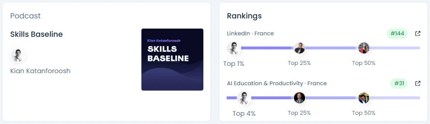 Kian’s following has grown from 29.8K to over 41.6K on LinkedIn, with steady organic engagement and no artificial spikes. His Influence Score of 6,976 points places him in the Top 1% in France and the Top 4% in AI Education & Productivity. His content consistently reaches thousands of professionals and students, generating active discussion around AI, learning, and career development. Beyond LinkedIn, his podcast “Skills Baseline” amplifies his voice globally, adding to his authority in AI education and upskilling.