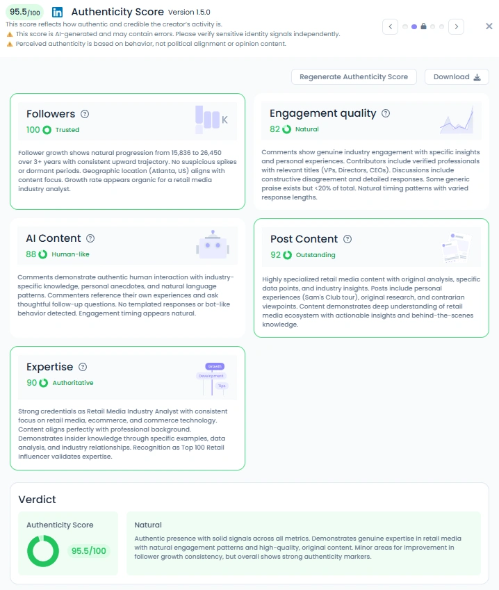 Kiri’s audience has grown from roughly 15,836 to 26,450 followers over three plus years, showing steady organic traction. Her content scores are strong Post Content 92 and Expertise 90 and engagement is healthy with thoughtful comments from VPs, strategists, and platform teams. She ranks highly on LinkedIn for retail and ecommerce audiences in Australia and has solid global reach. Her posting rhythm mixes timely analysis with recurring features and podcast episodes.