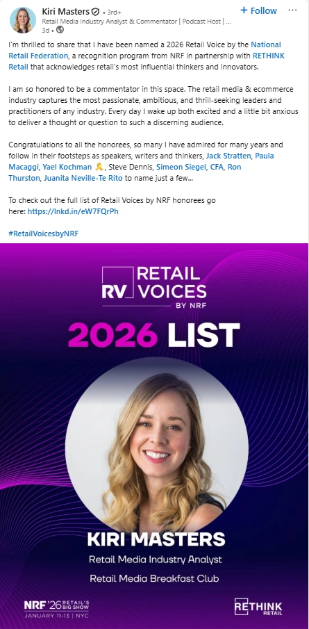 Kiri Masters talks retail media like someone who’s read the receipts and the future. Her work blends sharp industry analysis with friendly, human-first storytelling.