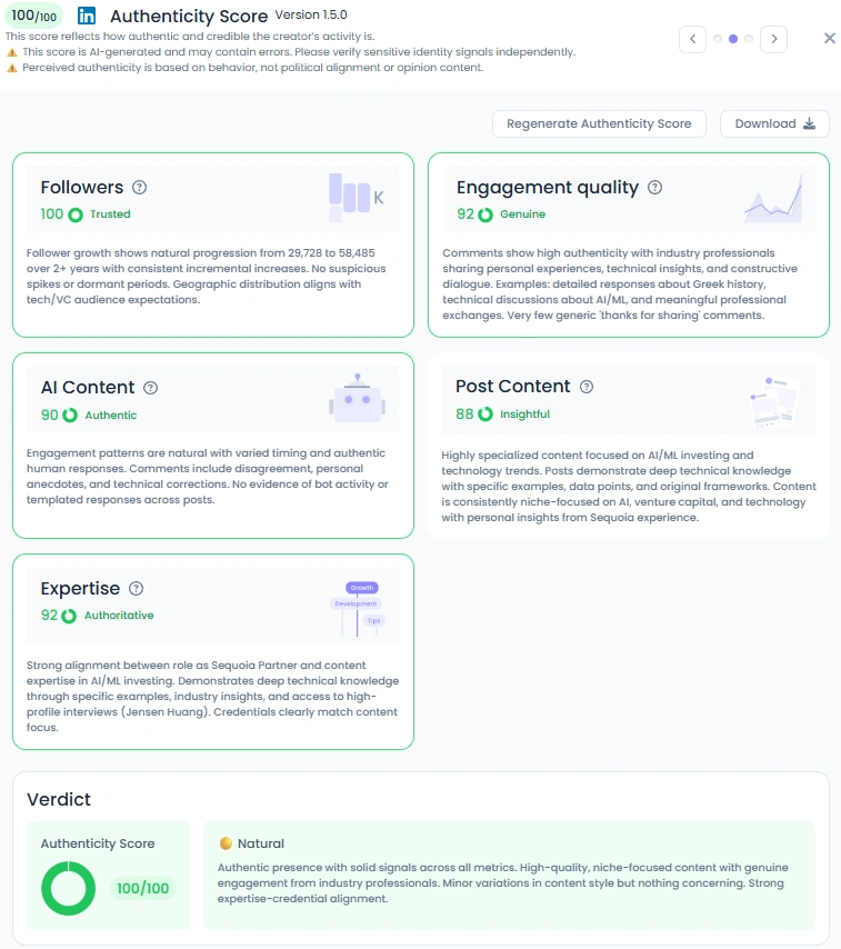 Konstantine holds an Favikon Authenticity Score of 100/100, a rare signal of trust and credibility in the tech world. His comments are filled with real discussions from founders, engineers, and professionals sharing insights and experiences. The engagement around his content feels natural and intelligent, not forced. His mix of curiosity and technical confidence creates a genuine connection with his audience and keeps his thought leadership grounded.