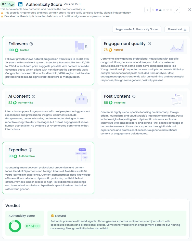 Her Favikon Authenticity Score comes in at 87.5/100, backed by real-world access and original reporting. Comments show colleagues and readers trading experiences, questions, and healthy disagreement. Even celebratory posts carry substance, including dates, places, names, and policy context. It is authority without distance.