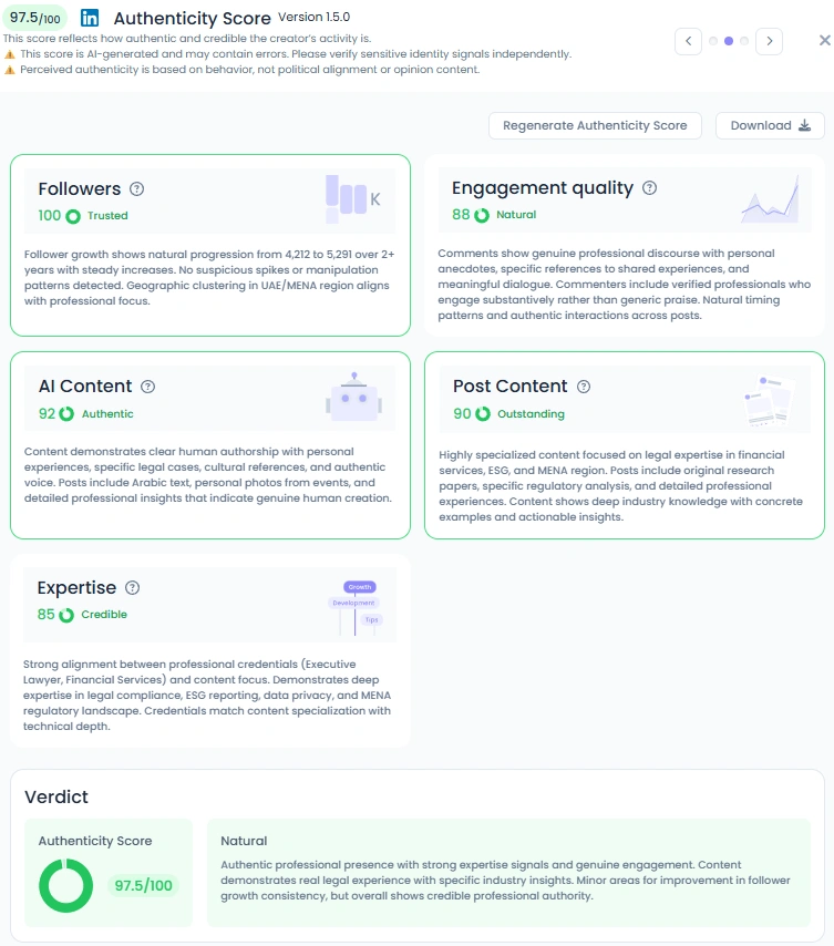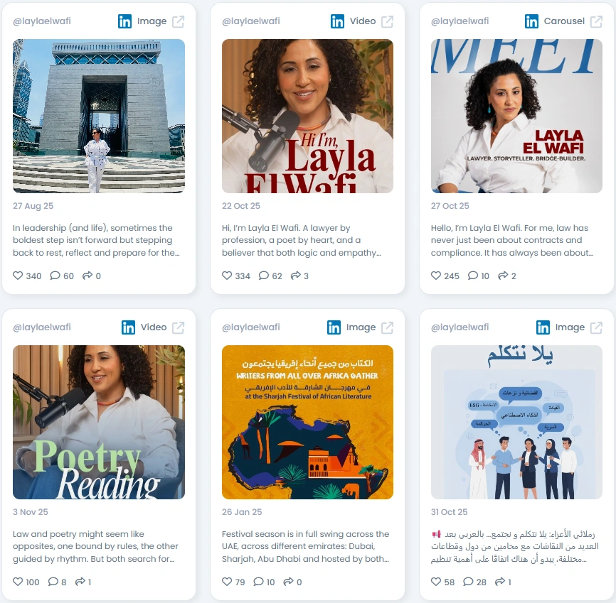 Layla holds a strong Favikon Authenticity Score of 97.5/100, supported by consistent human-driven engagement. Her content includes personal stories, cultural references, Arabic text, and real photos from her work and events. Comments on her posts show genuine professional interaction from people who know her field. Her authenticity shines through her openness, her voice as a poet, and her willingness to discuss leadership from a reflective perspective. Nothing feels templated. Everything feels lived.