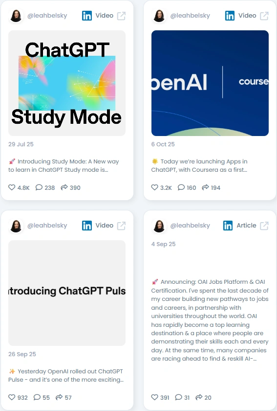 Leah’s timeline is dotted with market-moving work. Examples include OpenAI x Coursera announcements, ChatGPT Study Mode for learning, and the OAI Jobs Platform and Certification for talent pathways. She also spotlights Canvas and university pilots, connecting product to policy and classroom practice.