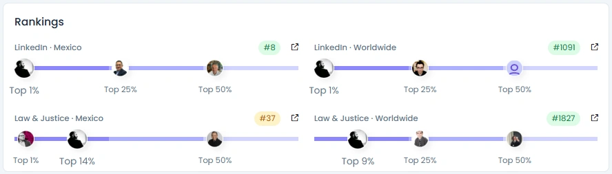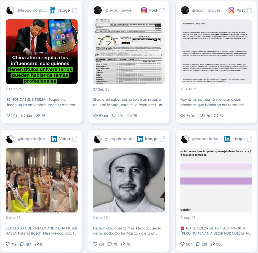 Leopoldo has grown his audience from 12,439 to 15,455 followers in 10 months, a steady organic climb. His Influence Score of 6 962 ptsplaces him in the top 1 percent on LinkedIn in Mexico and the top 1 percent in Law & Justice. His posts average 1.5K to 2K reactions, with several hitting over 50K views on Instagram. His platform blend is powerful, using LinkedIn for education and Instagram for visual storytelling. He posts consistently and each post delivers impact.