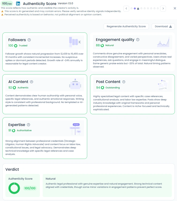 With a perfect Favikon Authenticity Score of 100/100, Leopoldo sets the bar for credibility on LinkedIn. His Post Content score of 94 and AI Content score of 92 reflect content that is both technically strong and emotionally human. Every post feels like it’s coming from a real person with real experience and a mission. His legal explanations are layered with personal conviction, and he consistently invites critical thinking and public dialogue. His comment sections often include personal stories, case references, and genuine debate, proving that his community values depth and action.