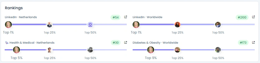Liesbeth’s follower growth moved from about 32,509 to 46,088 over two plus years, reflecting steady professional interest. Her influence score sits at 7,417 points and engagement quality is rated Natural. Post content scores highly for originality and clinical value. She posts around conferences, publications, and evidence summaries that attract meaningful discussion.