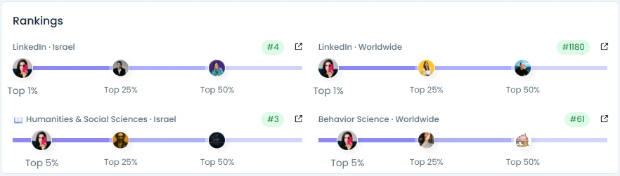 Liraz has grown her audience steadily to over 59,000 followers across her main platforms, with a healthy +19% growth rate over eight months. She ranks in the Top 1% on LinkedIn in Israel and in the Top 5% in Behavioral Science worldwide. Her Influence Score sits at 8,017 points, and her content regularly drives thousands of interactions, showing both consistency and reach.
