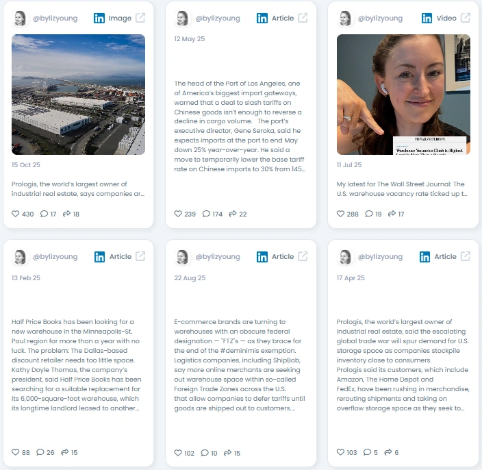 Liz sits at the center of a big ecosystem: logistics firms, retail brands, port authorities, real estate owners, and trade policy experts. Her work cites sources at Amazon, DHL, UPS, major ports, and industry analysts. She also connects with academic experts and government officials who shape trade flows. That network gives her reporting both depth and credibility.