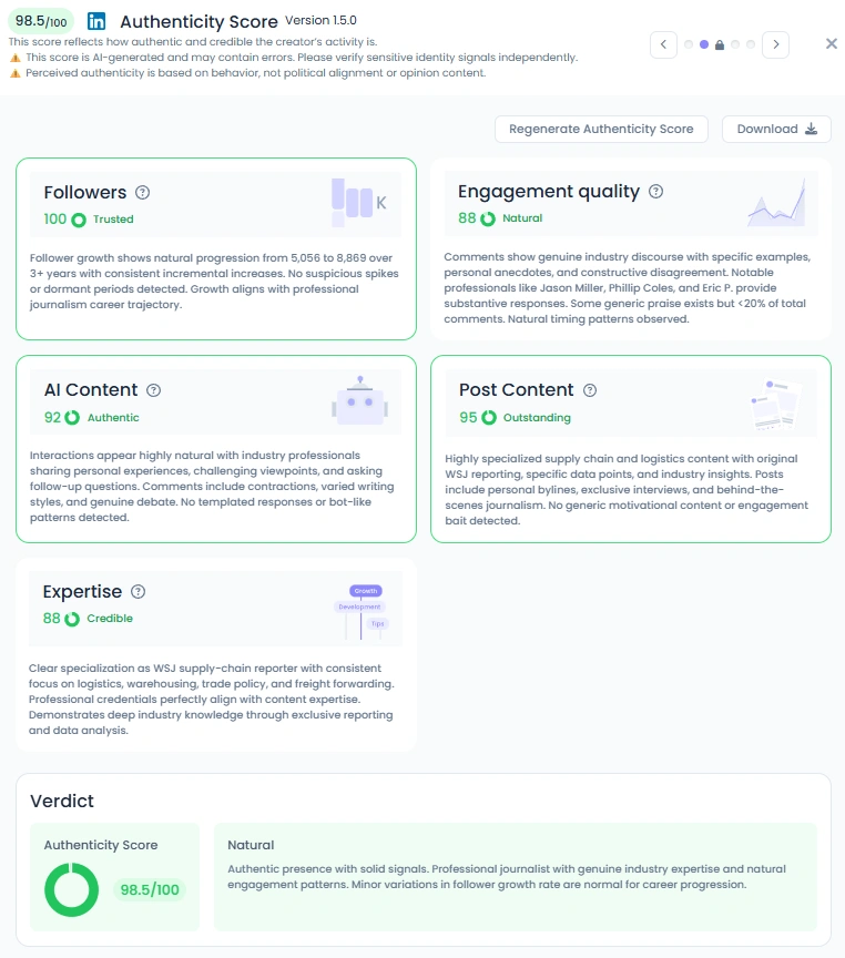Favikon gives Liz a 98.5/100 Authenticity Score, reflecting steady professional activity and strong audience signals. Her timeline shows original reporting, field photos, and article links instead of reposted commentary. Comments come from industry professionals and peers who add nuance and verification. That pattern makes her presence feel authoritative and reliable.