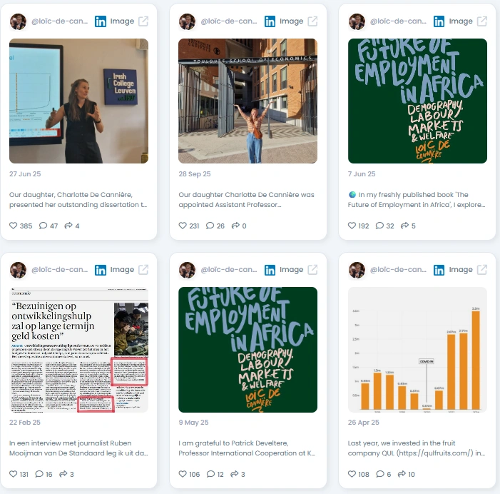 Loïc scores a perfect 100 on Favikon’s Authenticity Score. His engagement patterns are natural and professional, with substantive dialogue in the comments. He shares publications, on-the-ground investment stories, and thoughtful reflections that invite critique and conversation. The result is an authoritative voice that still feels accessible.