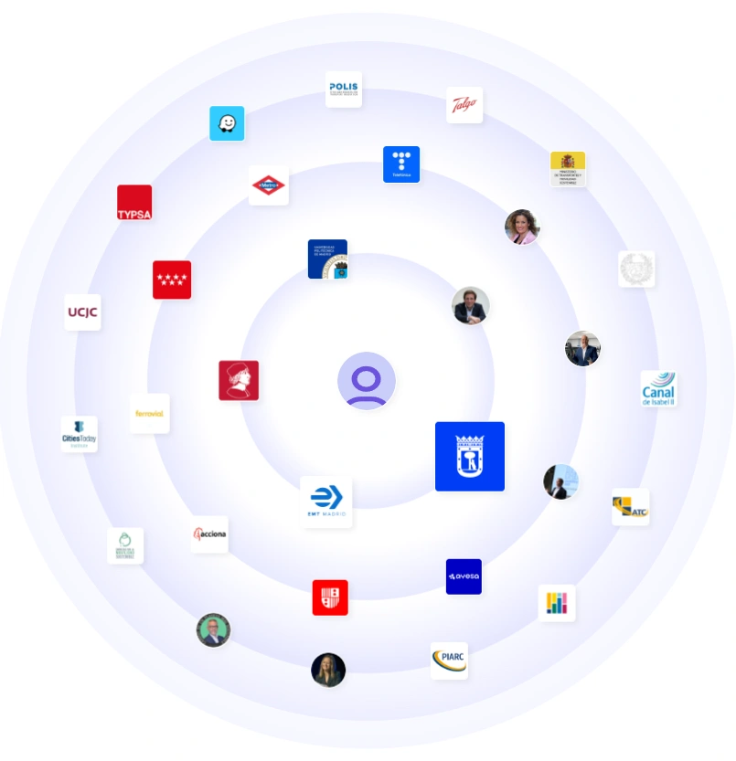Her network spans Madrid city institutions, transport operators, major contractors, and international mobility groups. Logos and connections include EMT Madrid, Metro de Madrid, Canal de Isabel II, Acciona, Ferrovial, Talgo, and municipal bodies. She also shows ties to academic partners and industry associations that validate her projects. That mix gives her both local authority and a seat at broader urbanism conversations.