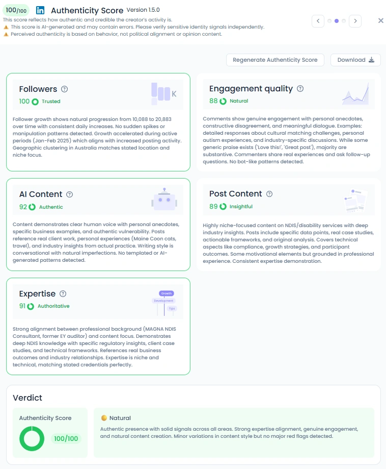 Favikon gives her a 100 out of 100 Authenticity Score. Comments sound like real providers sharing wins, misses, and questions. She shows vulnerability about burnout and family life and still delivers data. That balance makes expertise feel safe to follow.