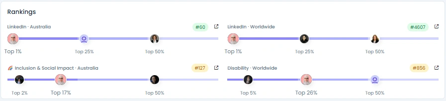 Her audience grew from 10,088 to 20,883 in steady, organic waves. Quality signals read Engagement 88, AI content 92, Post content 89, and Expertise 91. Influence Score sits at 5,562 points. Rankings include #60 on LinkedIn Australia, #127 in Inclusion and Social Impact Australia, #4607 worldwide on LinkedIn, and #856 worldwide in Disability.