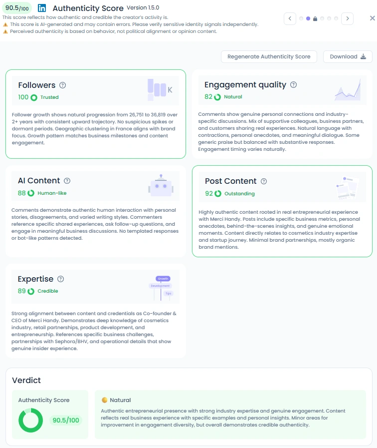 Louis holds a Favikon Authenticity Score of 90.5 out of 100, which reflects a natural and credible presence. His comments feature detailed stories, disagreements, follow up questions, and a variety of tones. His posts include personal anecdotes, family moments, business milestones, and honest reflections about retail decisions. He balances authority with relatability by revealing the creative chaos behind products and sharing emotional reactions during key moments. Nothing feels templated, and the mix of fun visuals with real founder insights creates strong authenticity.