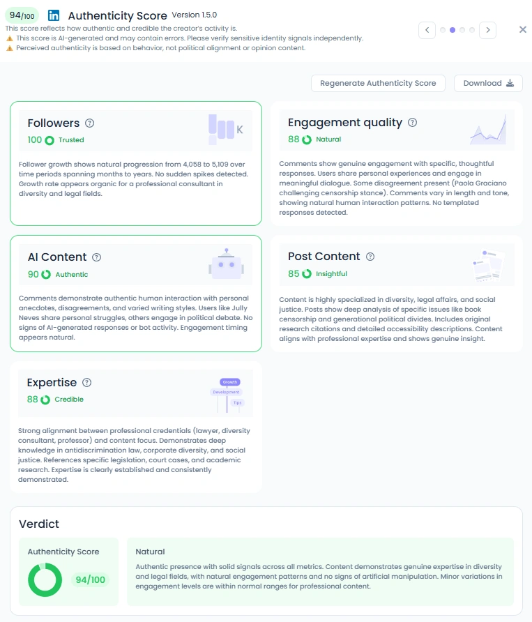 Luanda holds a strong Authenticity Score of 94. Her posts show natural engagement, varied conversations, and thoughtful exchanges with her audience. She receives comments from people sharing lived experiences, disagreements, or personal stories, and she responds in an organic, human way. Her tone stays consistent whether she writes about legal victories or social setbacks. Nothing feels templated. Her presence feels like a real expert speaking to real people.
