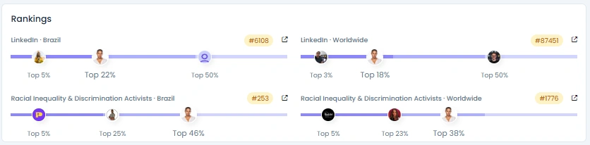 Luanda has a follower base growing steadily from about 4,058 to 5,109 over months, with no artificial spikes. Her influence score sits at 4,382 points, placing her comfortably in the top tiers of professionals in her category. Engagement quality is strong, with meaningful comments and natural conversation patterns across posts. She ranks in the top percentiles for LinkedIn Brazil and for racial equality and discrimination activism worldwide.