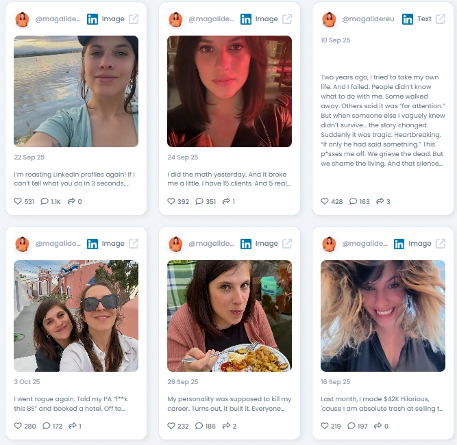 Magali De Reu is the personal branding coach who tells the truth and helps you sell it. She builds bold voices for neurodivergent speakers and founders. Her feed reads like a diary with receipts. Hard moments, real numbers, and clear playbooks.