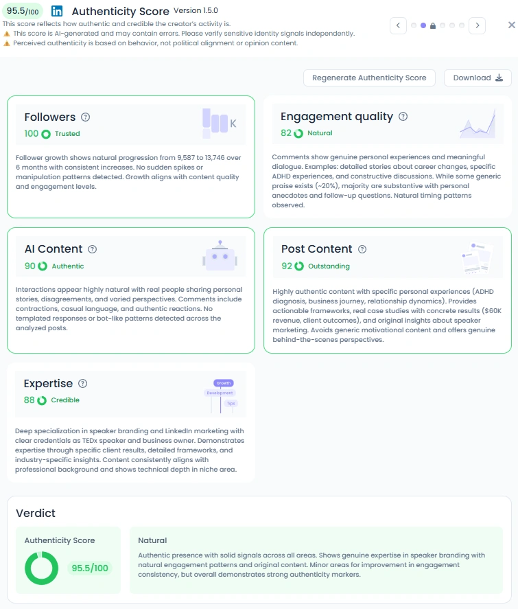 Her Favikon Authenticity Score is 95.5/100. Engagement quality sits at 82 Natural and AI content signals at 90 Authentic. Posts cover ADHD diagnosis, business decisions, and relationship dynamics with zero templated language. Photos are casual and present tense, which keeps the story close and believable.