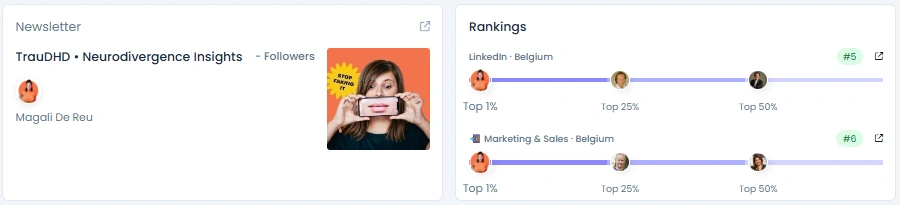 Followers climbed from 9,587 to 13,746 in six months with clean growth patterns. Post content scores 92 Outstanding and expertise 88 Credible. Influence Score is 7,379 pts. On rankings she sits in Belgium’s Top 1% for LinkedIn (#5) and Marketing & Sales (#6). The newsletter TrauDHD • Neurodivergence Insights extends her reach with deeper essays.