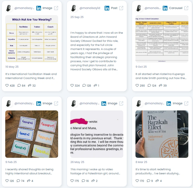 Manal speaks like a facilitator in the room. Calm tone, sharp prompts, and real stories from sessions. She shows the worksheet, then shows how it works. She is candid about learning, which makes people join the conversation, not just like the post.