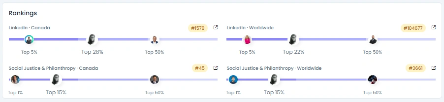 Her LinkedIn following grew from 6,046 to 9,856 over more than three years, a clear and organic climb. Engagement quality is 89, with niche discussions and low generic responses. Influence Score sits at 5,998 pts, with a posting rhythm that favors useful visuals and debrief threads. She ranks Top 5% in LinkedIn Canada and Top 1% to Top 15% in Social Justice and Philanthropy leaderboards in Canada and worldwide.