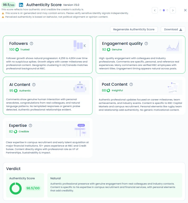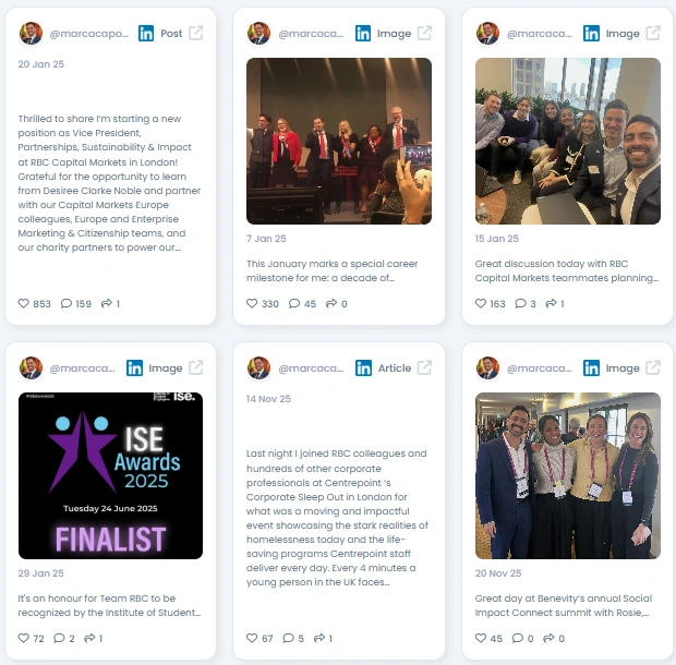 With an Authenticity Score of 98.5, Marc shows what natural influence looks like. His posts feature real group photos, candid event shots, and heartfelt notes to colleagues. Comments come from verified industry professionals who know him personally. His content includes genuine reflections about social impact, volunteerism, and professional milestones. Nothing feels staged and everything reflects lived experience.