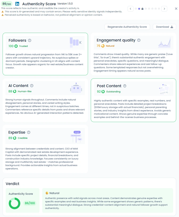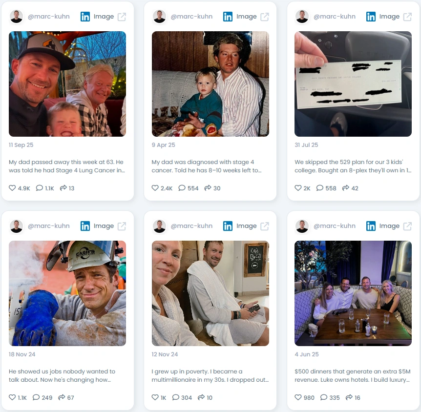 Marc scores an 86/100 for overall Authenticity with a "Natural" verdict, supported by a Trusted 100/100 for Followers. His posts are incredibly transparent, blending professional achievements with deep personal moments. He shares vulnerable stories about his father's cancer and his own past working construction . This human-like approach earns an AI Content score of 88 and allows him to connect with his audience on a profound, relatable level.